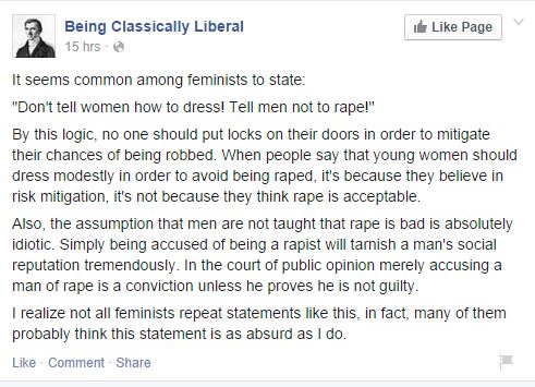 A page on Facebook called Being Classically Liberal (BCL), a Libertarian page, posted commentary on how women can reduce the risk of rape: By dressing modestly. The poster explains: