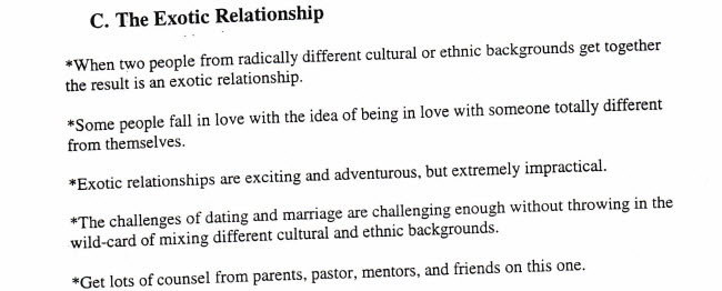 It is suggested that students find partners with “similar backgrounds.” In fact, students are warned against forming “exotic” relationships — when two people “from radically different cultural or ethnic backgrounds” come together.