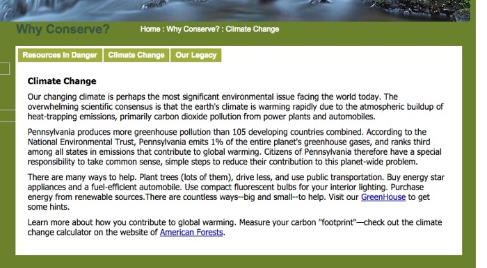 In the “Why Conserve?” section of the site, a page labeled “Climate Change” no longer appears. The page appeared on an archived version of the site in 2011. It read: “The overwhelming scientific consensus is that the earth’s climate is warming rapidly due to the atmospheric buildup of heat-trapping emissions, primarily carbon dioxide pollution from power plants and automobiles.” The page does not appear in a subsequent archive of the site from August, 2012.
