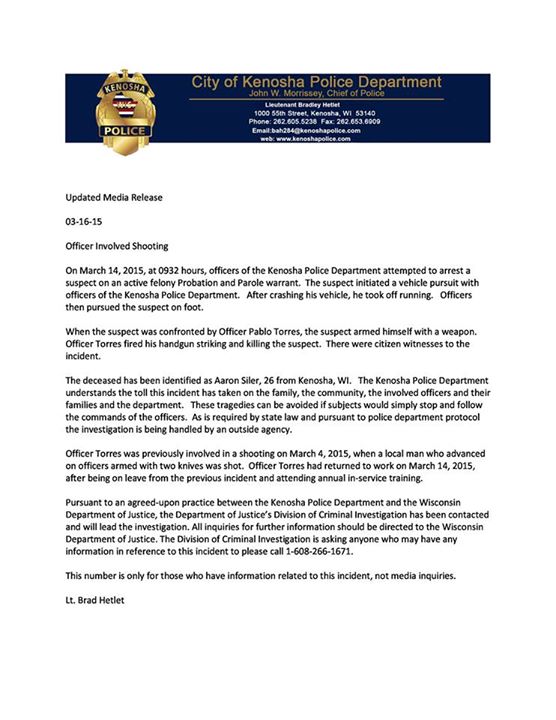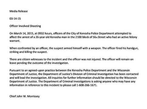 The Kenosha Professional Police Association told the Milwaukee Journal Sentinel: