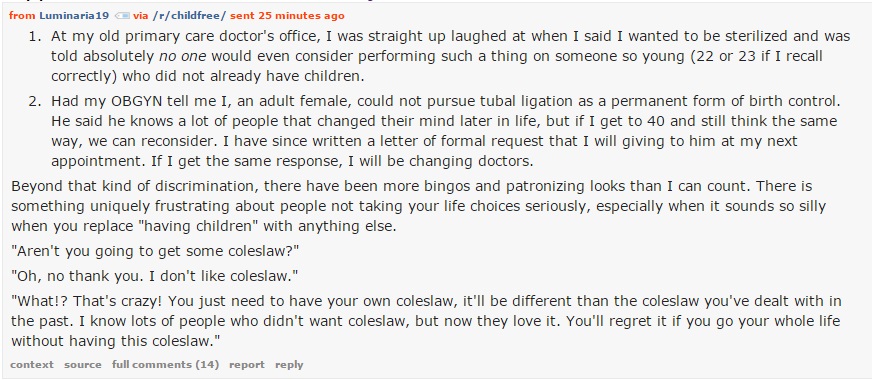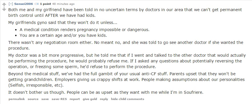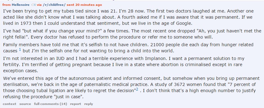 A little closer to home, another user described, much like my own experience, being unable to get permanent birth control until both partners in the relationship were past a certain age and/or had children: