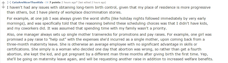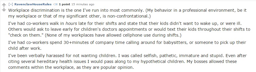 Another user described blatant discrimination in the workplace (contrary to popular belief, Childfree people have families as well):