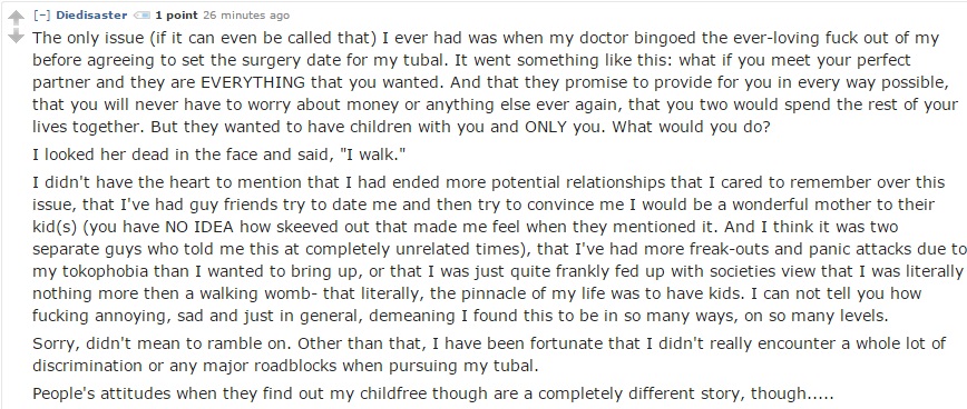 Yet another user describes multiple doctors treating her with disrespect and refusing to let her make her own choices, as well as the social stigma all of us are all too familiar with: