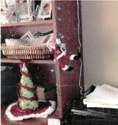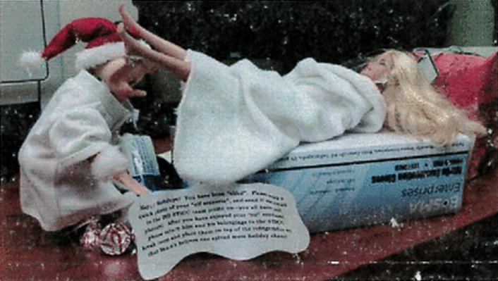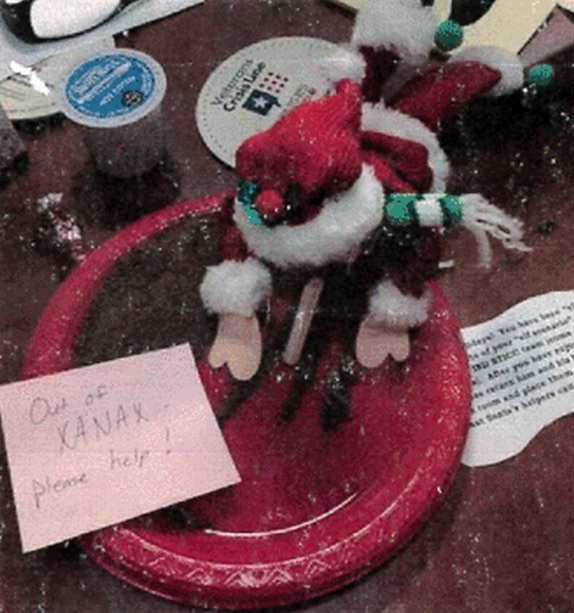 Another image Paul included in her email shows an elf next to a post-it note that reads, “Out of XANAX – please help!” Above the photograph her caption says: “Self-medicating for mental health issues when a CNS would not give him his requested script.”
