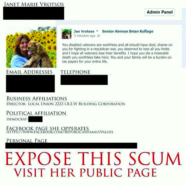 Jan’s personal information is blacked out, but her address, telephone number and contact information for the union she retired from was posted. She received death threats by email, conventional mail and by phone, and has spent more than a year traumatized over the incident.