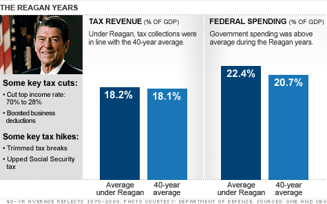 Reagan’s tax hike was at 18.2 percent at the end of his presidency, compared to a 40-year average of 18.1 percent. In layman’s he raised taxes so high, it usually take 40 years to generate that much revenue from taxes. And yet he’s known as the patron saint of lower taxes. If we know anything about Conservatives of today, they’re very critical of tax increases and the deficit under Obama, but very forgiving of Reagan’s record. Very interesting.