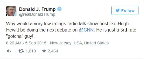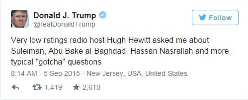 Of course, Hewitt probably didn’t intend to make Trump look stupid — why should Hewitt get all the credit? — but that didn’t stop Trump from accusing Hewitt of asking “gotcha questions” and dismissing questions about ISIL as “inappropriate.” Trump would also call Hewitt a “third-rate radio announcer” on MSNBC’s Morning Joe.