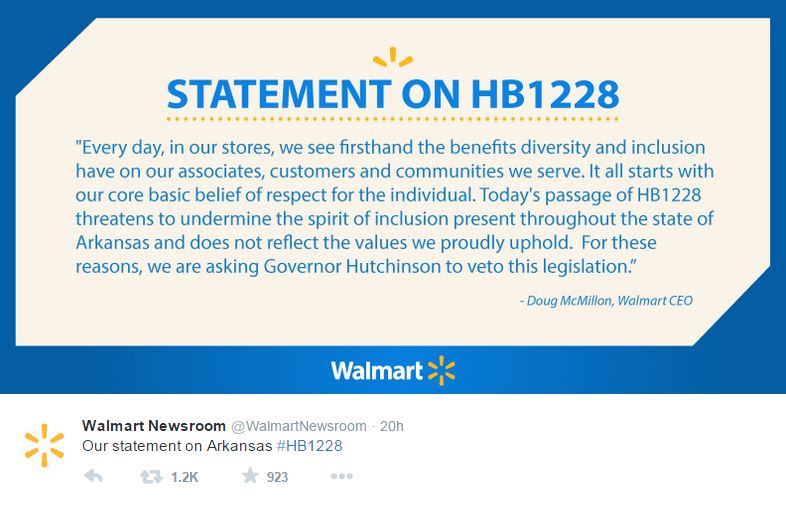 Retail giant Walmart, headquartered in Arkansas, could have influenced Hutchinson’s bill rejection, too. While normally regarded to be anti-progressive, the corporation’s CEO Doug McMillon released a statement, including via Twitter, on March 31 calling for the governor to veto H.B. 1228.