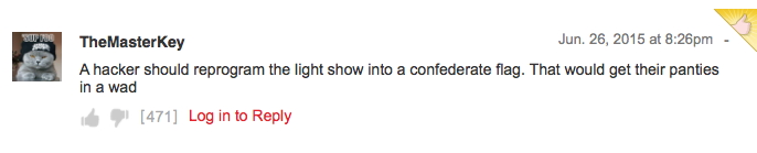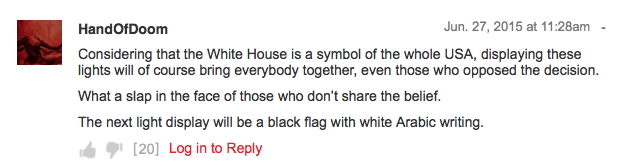 Breitbart wasn’t so even handed with their coverage. Their headline proclaims “OBAMA ADMIN FLAUNTS RAINBOW WHITE HOUSE AFTER SAME-SEX MARRIAGE RULING.” An updated headline says “UPDATE: The Obama administration has set up rainbow-colored lights to illuminate the real-life White House.”