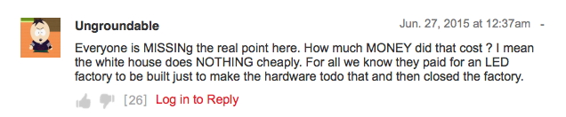 This person is upset about the lights on the White House. I wonder how he/she felt about that “Mission Accomplished” banner on the aircraft carrier?