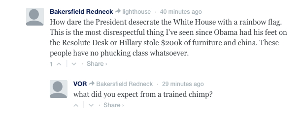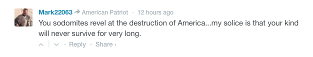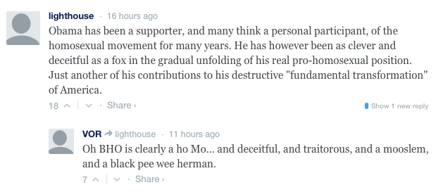 Or this one, where “VOR” responds with a comment that shows he’s a racist as well as a homophobe.