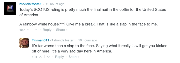 Rhonda Foster and “Tinman311” decided to cry to each other about how giving people equal rights is the end of America. Didn’t segregationists say the same sort of things?