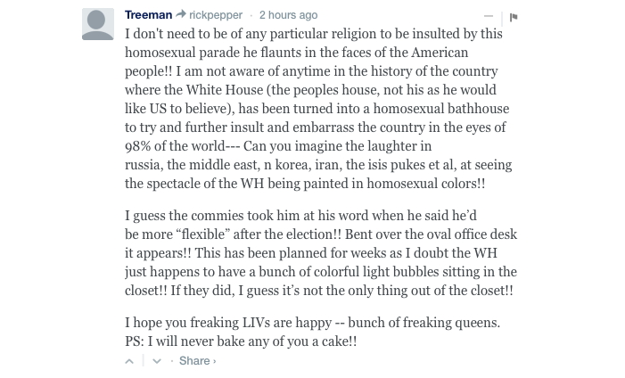 “Makingout” is another who thinks the rainbow White House is “proof” that the president is gay. At least he/she didn’t go for the nonsense about Michelle being transgender.