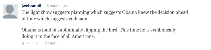 The stupid is strong with “jwebsmall,” who thinks that the president was in cahoots with the justices. He obviously doesn’t realize that the exterior of the White House is lit at night, and producing the rainbow was as simple as changing a few light bulbs.