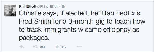 Phil Elliott of Time tweeted, “Christie says, if elected, he’ll tap FedEx’s Fred Smith for a 3-month gig to teach how to track immigrants w same efficiency as packages.”