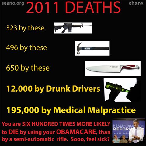 Why? Well, because the ACA is related to doctors, who are related to medical malpractice, so if doctors are related to weapons through deaths caused by malpractice, then the ACA can kill you. Ok, that was difficult to follow, because if you have the ability to comprehend logic, this can not be followed to any logical conclusion.