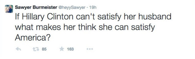 Trump retweeted, then deleted, a horrible statement about Clinton on Thursday — one that suggested she isn’t right for America because her husband chose to cheat on her. “If Hillary Clinton can’t satisfy her husband what makes her think she can satisfy America?” Trump tweeted.