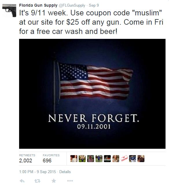 The not-intolerant owner of Florida Gun Supply wants you to use the coupon code “muslim” for $25 bucks off any gun, and a free car wash and beer.