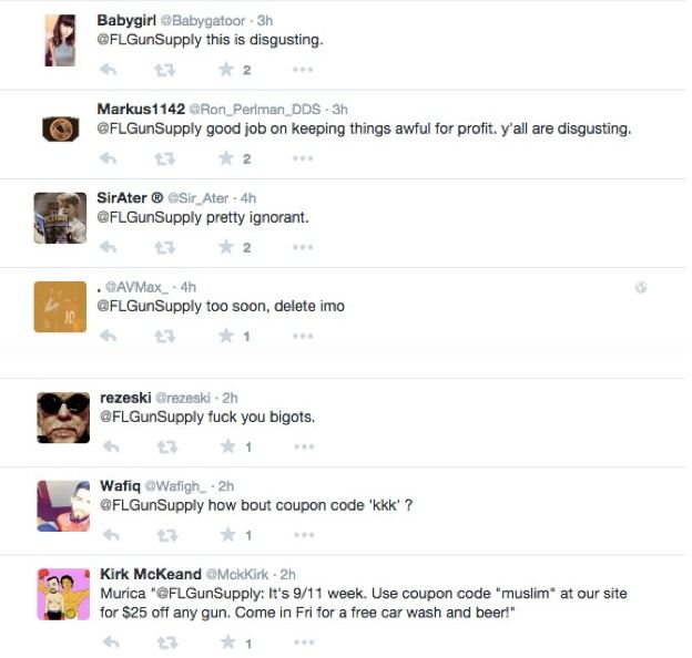 Awwww, look at the little butthurt libturds … quite the “epic” Twitter smackdown, do you say? Yea, totally. All that whining “you’re disgusting” for offering a 9/11 coupon code and a weekend promotion is SOOO mature and so useful. No wonder you poor little cowardly libturds are losing the gun debate so badly in this country.