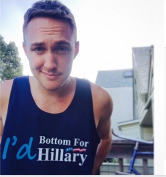 The horse race for the 2016 presidential bid is heating up for sure now, and Democratic favorite Hillary Clinton has some great support going already, even though she just announced her intention to run this past Sunday. Well, some gay guys in San Francisco have found an incredibly unique- and very gay- way to let the whole world know that they are gunning for the former Secretary of State to become America’s first female president: Tank tops with the slogan “I’d bottom for Hillary.”