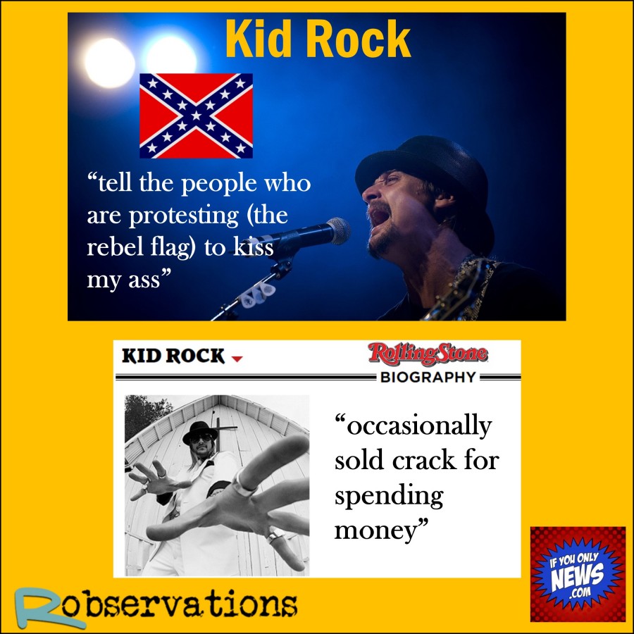 This comment on the Confederate flag was issued recently, right before South Carolina legislature’s decision to remove that Civil War symbol from its state house grounds. At least Kid Rock (whose stage name sounds identical to the street name for the drug he once sold) didn’t respond with the blatant racism others were offering at that same time.