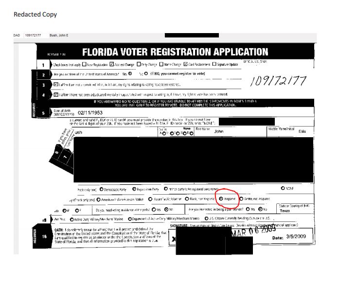 On his last voter registration, submitted in March 2009 to accommodate a recent address change, Bush selected “Hispanic” instead of “White, not Hispanic.”