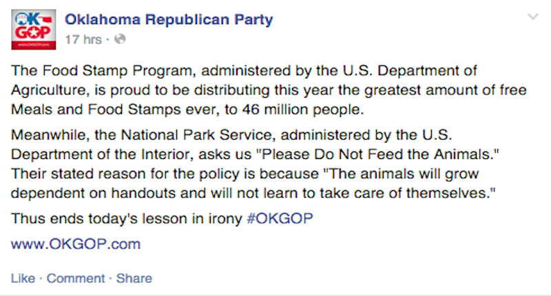 The largest population of food stamp and government assistance recipients live in red states, and they tend to vote Republic. Despite this, the Oklahoma Republican Party had no problem sharing a viral Facebook post that compared people in the SNAP program to wild animals.