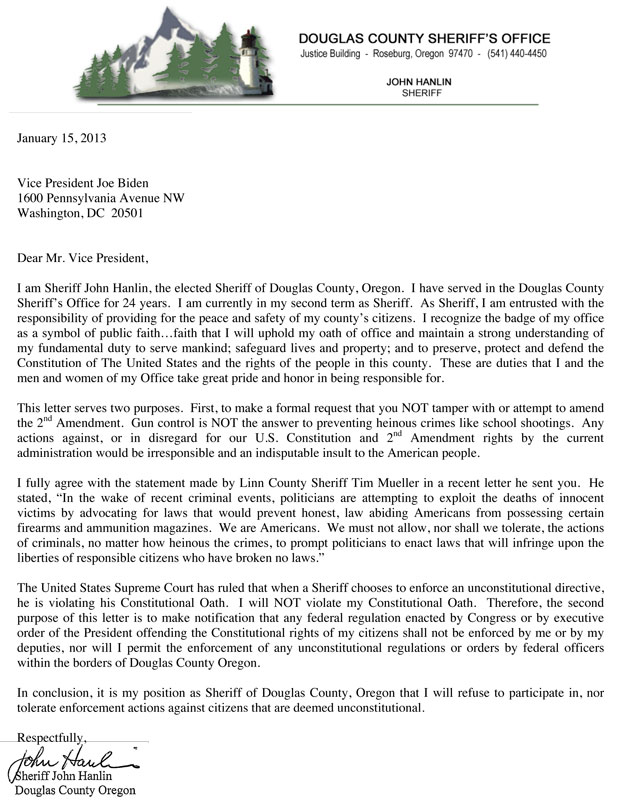 The Oregon Sheriff in charge of most recent shooting wrote letter to White House after Newtown saying and he would not follow any new legislation enacted because it would be “unconstitutional” and that: