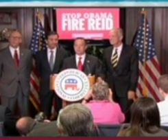 The official GOP press conference to discuss the election results was held in typical fashion: Podium, American flag, high-profile politicians and strategists and of course the big red screen that read “Stop Obama, Fire Reid.”
