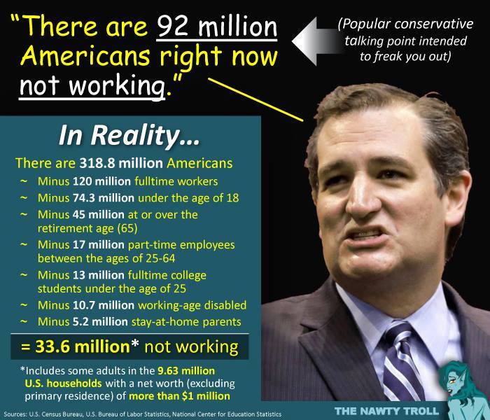 If you think that the elderly, teenagers, the disabled, the war veterans, the mentally ill, and the parents of infants should be in the “work force” and counted in this stupidly vague statistic you are wrong. If you think feeding them is bad for the country, you are a douchebag.