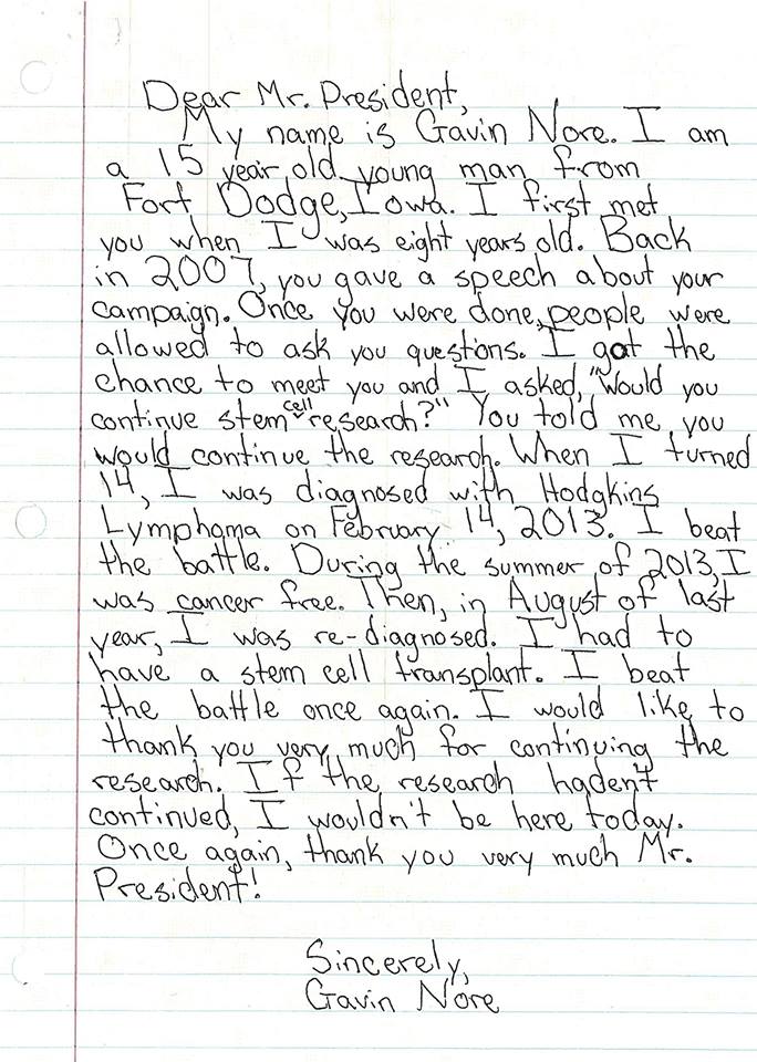 At a time where the anti-choice crowd is yowling in a fevered pitch over the recent release of undercover Planned Parenthood videos, 15-year-old Gavin Nore is thanking President Obama for his second chance at life.