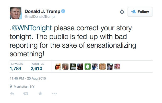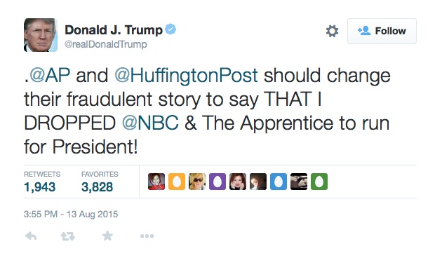He also whined for the Associated Press and The Huffington Post to correct their allegedly fraudulent stories about why he left NBC and “The Apprentice”: