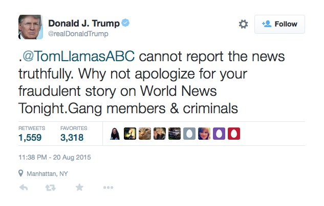 The ABC News reporter in question, Tom Llamas, had a video on “World News Tonight” of an interview with both Trump, and Jeb Bush, about using the term “anchor baby.” The Hill reports that Trump took to Twitter to whine bitterly about this, saying: