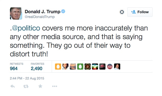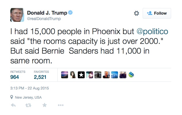 He was busily bashing Politico earlier for saying his claim that he had 15,000 people attend his rally in Phoenix is bogus: