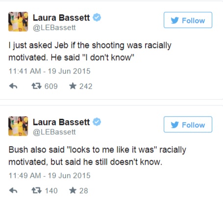 Utterly flabbergasted that Jeb, the least clownish of the 2016 clowns, would equivocate on the racial element, Huffington Post’s politics reporter Laura Bassett pushed him further: