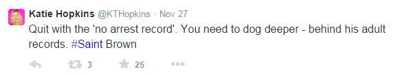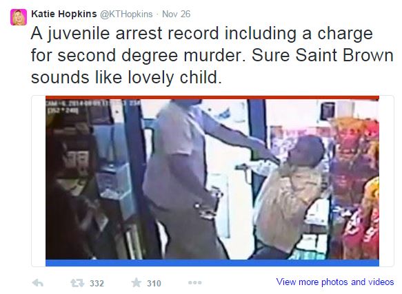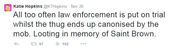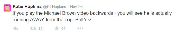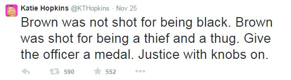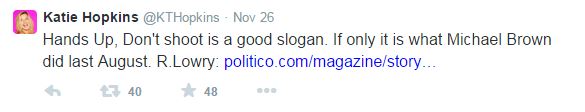 Opposing Views reports Hopkins found time to take a break from posting nasty tweets about fat people to lob a few vile, racist comments about Michael Brown to her followers. After St. Louis County prosecutor Robert McCulloch announced the grand jury had declined to prosecute, Hopkins tweeted:
