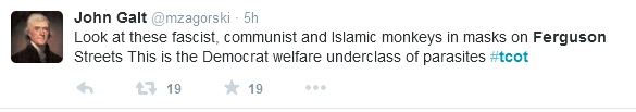 Oh look, someone is using John Galt as a Twitter handle. Charming. How…. thirteen-year-old of them. Their comment only reinforces this, with ugly racist rhetoric. Think they got all the right words in?: