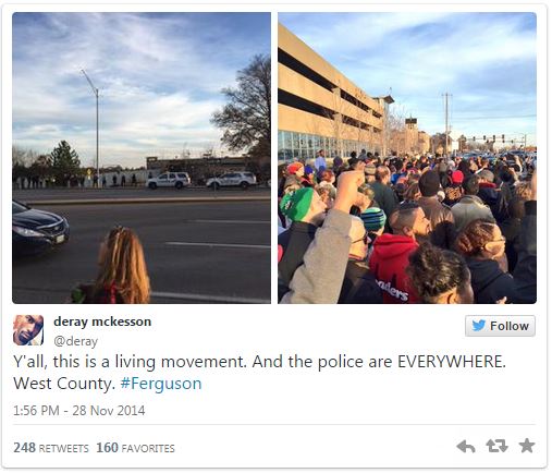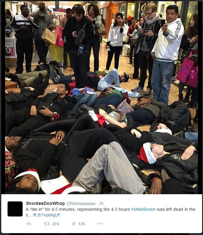 Hundreds of Black Friday and Ferguson protesters gathered at the Galleria Mall in St. Louis to block shoppers and stage a die-in. The mall shut down for several hours, and for once, police did not get violent or arrest anyone.