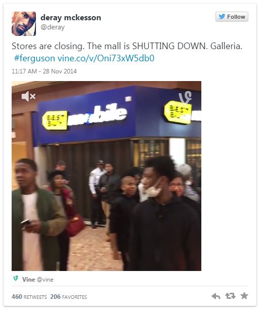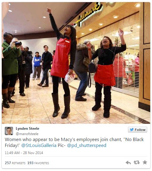 Organized on Twitter with the hashtags #NotOneDime, #BlackLivesMatter, and #StlBlackFriday, Fox2Now reports the Black Friday protests started when word got out for protesters to meet at Shaw Park at 11:30 a.m. From there, organizers told them to “get into the Galleria.”