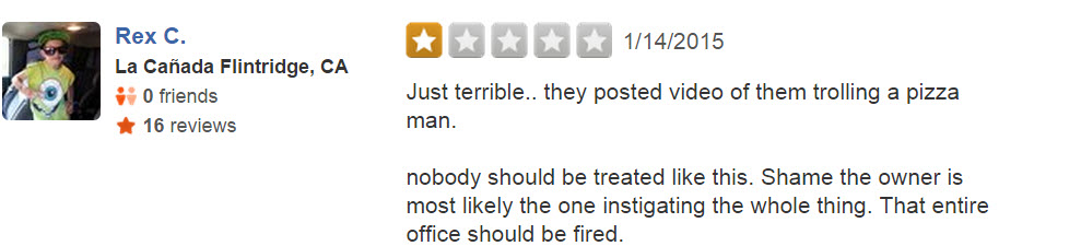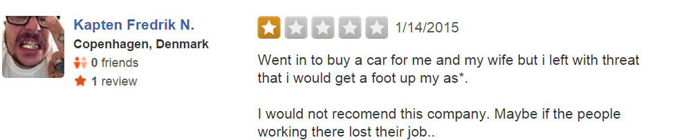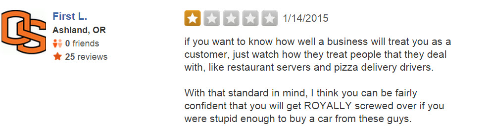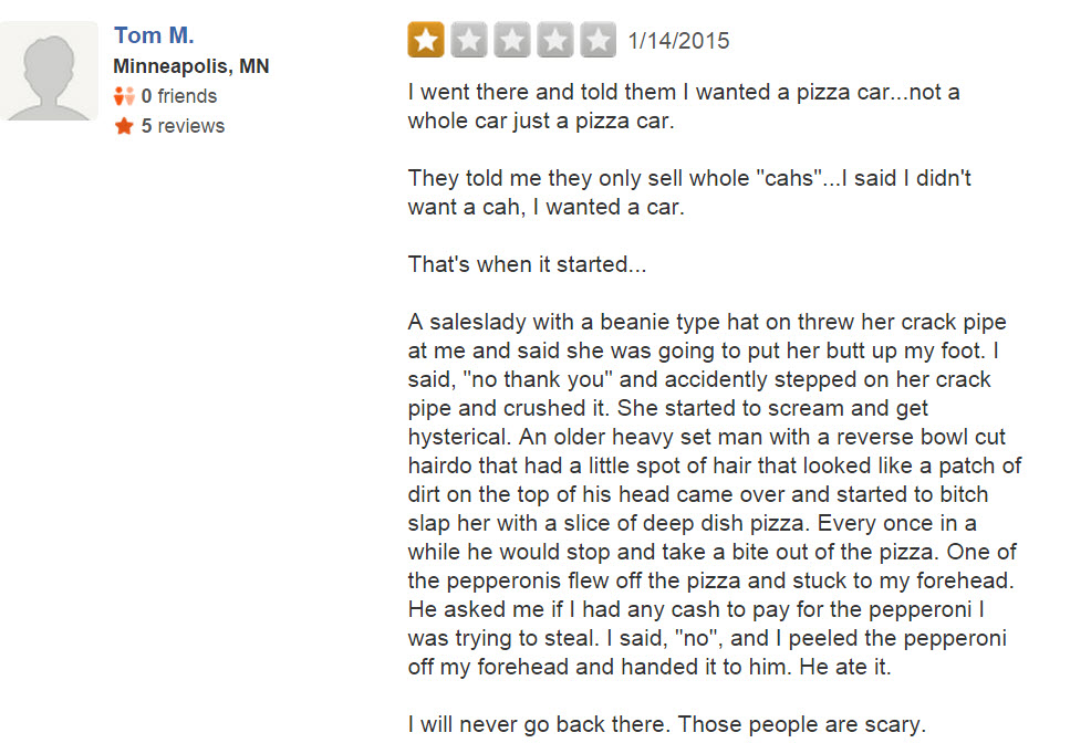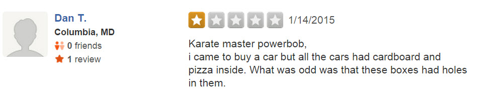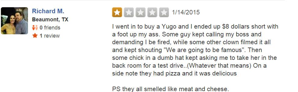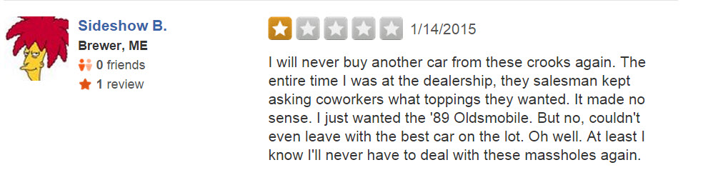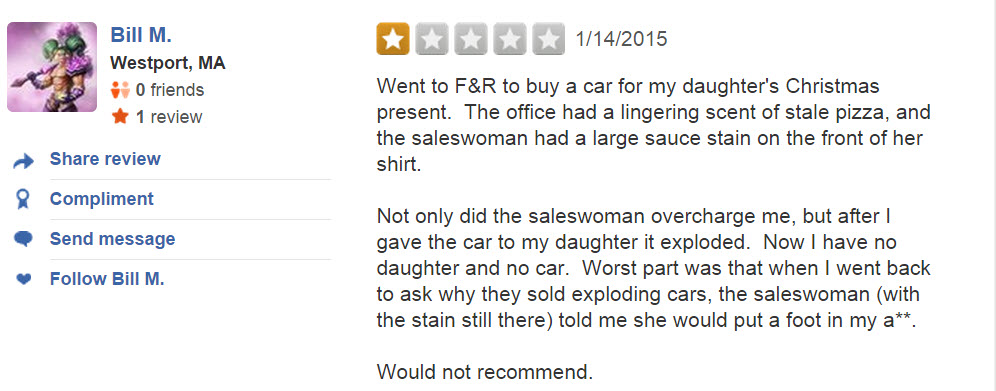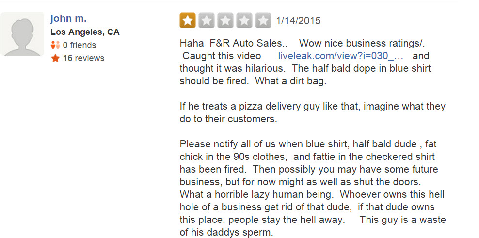 Naturally, the car dealership proudly posted the video online (with the intent of humiliating the poor driver), but the internet responded in a way they surely didn’t expect. F&R’s Yelp page is overrun with one-star reviews, many of which are pretty damn funny: