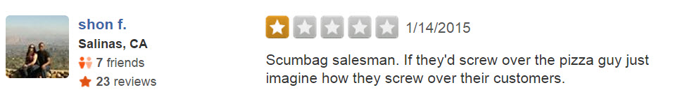 Unfortunately, what may seem to most like a reasonable, $7 tip for a $42 order, was a matter of life and death to the staff at F&R. The owner of the dealership called the pizza delivery place and complained to the manager.