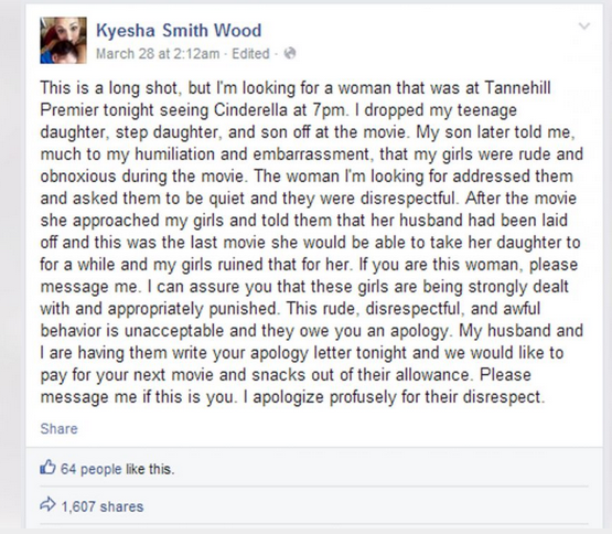 “This is a long shot, but I’m looking for a woman that was at Tannehill Premier tonight seeing Cinderella at 7pm. I dropped my teenage daughter, step daughter, and son off at the movie. My son later told me, much to my humiliation and embarrassment, that my girls were rude and obnoxious during the movie. The woman I’m looking for addressed them and asked them to be quiet and they were disrespectful. After the movie she approached my girls and told them that her husband had been laid off and this was the last movie she would be able to take hr daughter to for a while and my girls ruined that for her. If you are this woman, please message me. I can assure you that these girls are being strongly dealt with and appropriately punished. This rude, disrespectful, and awful behavior is unacceptable and they owe you an apology. My husband and I are having them write your apology letter tonight and we would like to pay for your next movie and snacks out of their allowance. Please message me if this is you. I apologize profusely for their disrespect.”