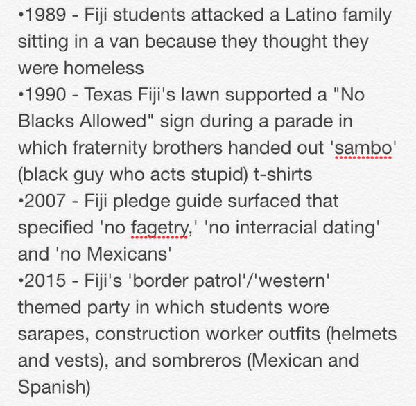 So, in other words, they are saying while they don’t condone racism on that campus, they certainly tolerate it from groups representing the school in an official capacity, such as fraternities. The worst of it is, though, is that the Fiji frat has been getting away with bigoted activity-some of it even criminal - for a couple of decades now. Here is a timeline of key events, for your convenience: