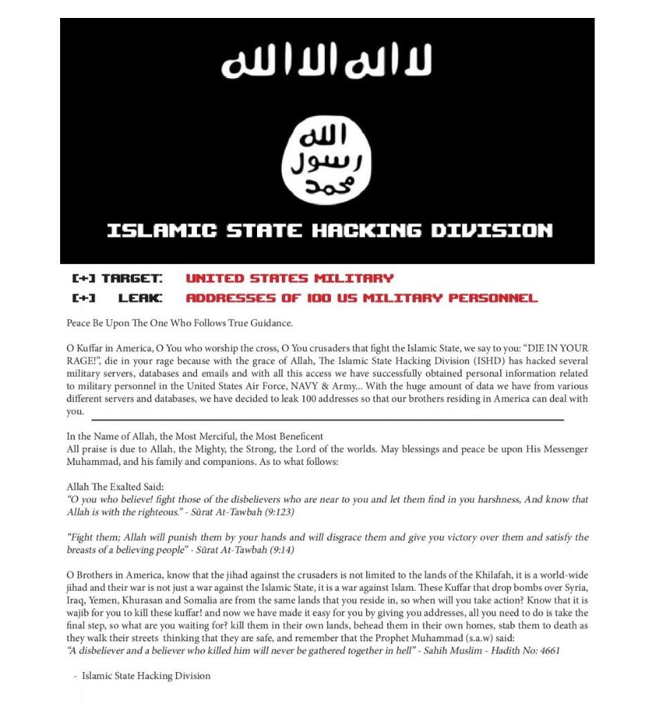 O Kuffar in America, O You who worship the cross, O You crusaders that fight the Islamic State, we say to you: “DIE IN YOUR RAGE!,” die in your rage because with the grace of Allah, The Islamic State Hacking Division (ISHD) has hacked several military servers, databases and emails and with all this access we have successfully obtained personal information related to military personnel in the United States Air Force, NAVY & Army.