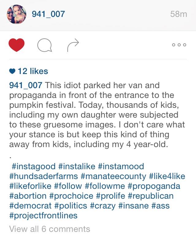 The Hunsader Farms Annual Pumpkin Festival has been a family event for 24 years in my county. Every year thousands of families flock to the farm and participate in games, pet animals and eat pumpkin flavored ice cream; but this year children will go to bed and have nightmares because a vapid anti-choicer decided that kids should be shown graphic anti-abortion pictures.