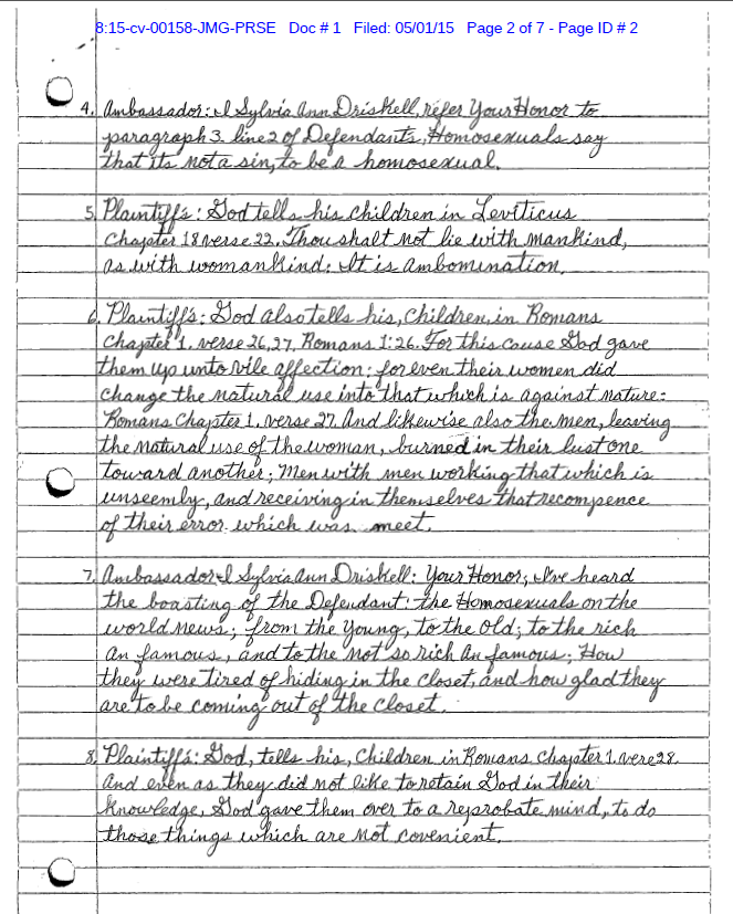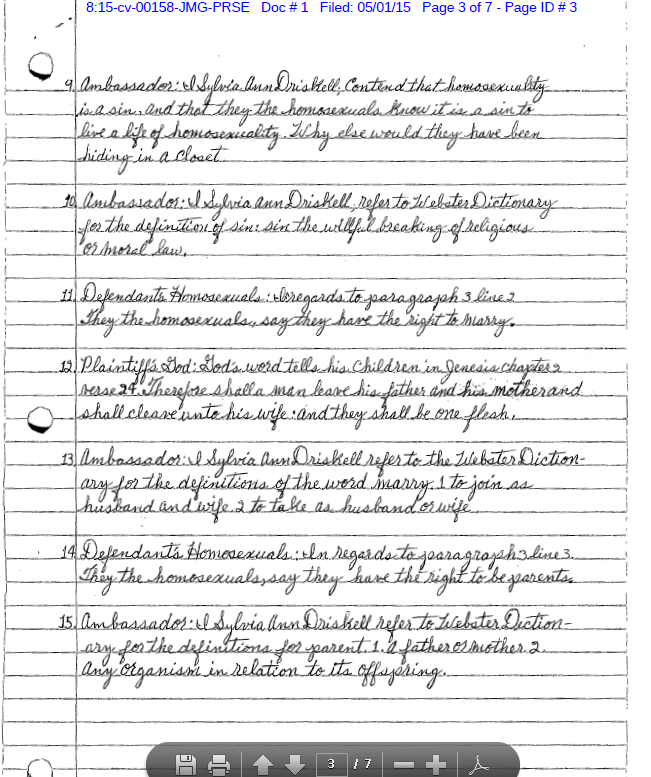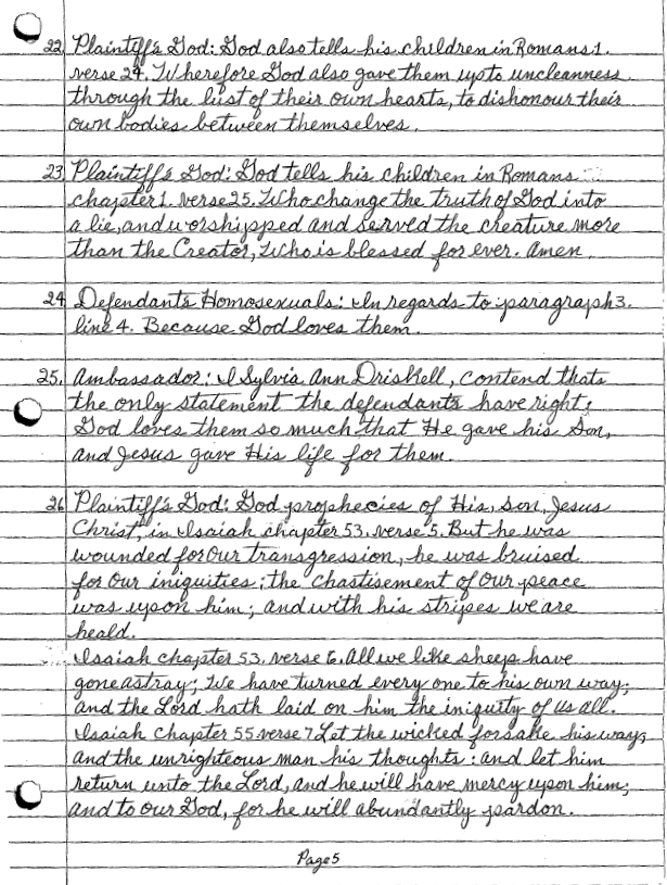 Ambassador: I Sylvia Ann Driskell, refer Your Honor to paragraph 3, line 2 of Defendant’s, Homosexuals say that its not a sin, to be a homosexual.