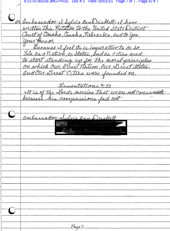 Ambassador: I Sylvia Ann Driskell ambassador for Plaintiffs do set forth on this 30 day of 2015 in writing this Petition to the United State District Court of Omaha, Omaha, Nebraska On behalf of the Plintiffs: God, and His, Son, Jesus Christ.