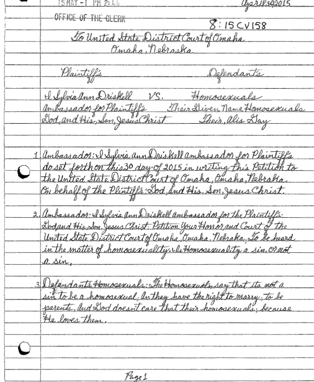 Not any particular homosexuals, not specific people who she feels have wronged her, but all homosexuals. In what seems like a humorous bit of satire but is in fact a sad reality, Sylvia Ann Driskell, who calls herself an “Ambassador of God,” will be representing herself in court against all homosexuals, probably because no lawyer is willing to risk their reputation over this woman’s lunacy.