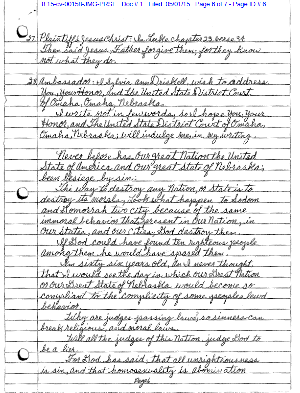 An obviously disturbed and ridiculously bigoted bible-thumper from Auburn, Nebraska has filed a lawsuit against homosexuals.