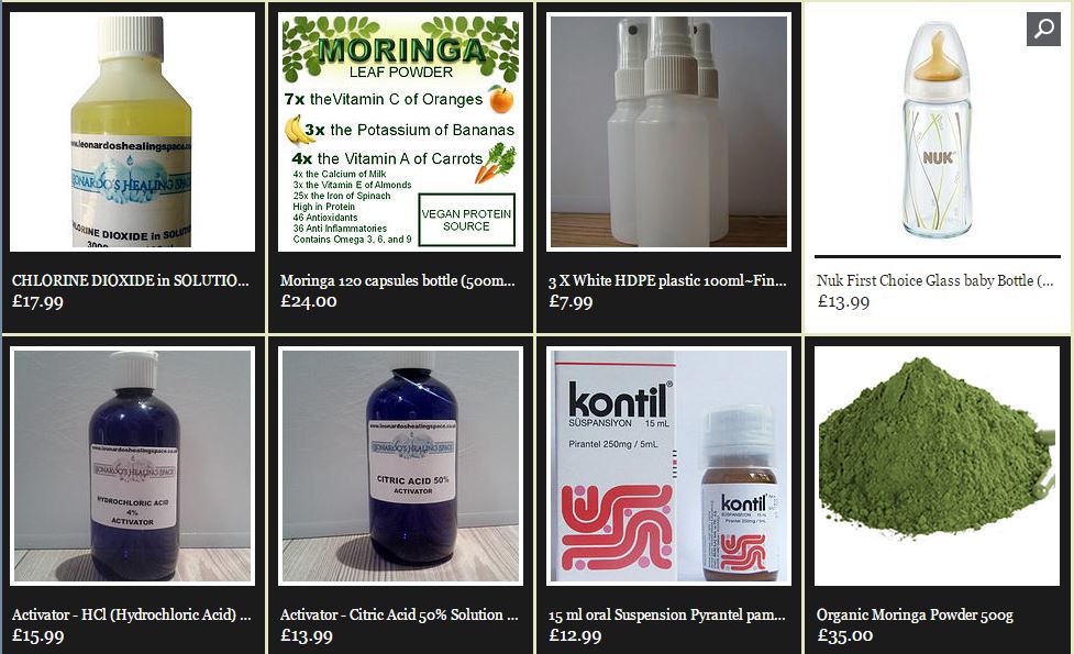 This website, called Leonard’s Healing Space, endorsed by Jim Humble, sells hydrochloric acid and chlorine dioxide products online for human consumption. Notice the baby bottle? Parents with infants are told this stuff is safe to use on babies for a number of ailments.